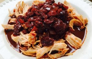 ضعي الدجاج، والبصل والطماطم، والثوم في وعاء ضغط واضبطيه على وضع الدواجن ثم تأكدي من تغطيته بإحكام واتركيه على النار لمدة 20دقيقة. ضعي الدجاج الناضج في صحن كبير، واضيفي عليه الكرز وصوص الشوكولاتة.