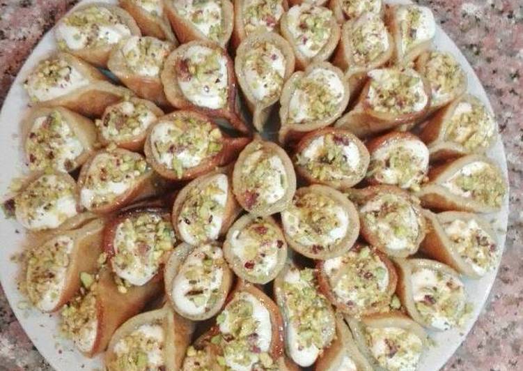 4. تغمس كل قطعة من القطايف من الجهة غير الملصقة في الفستق المطحون.