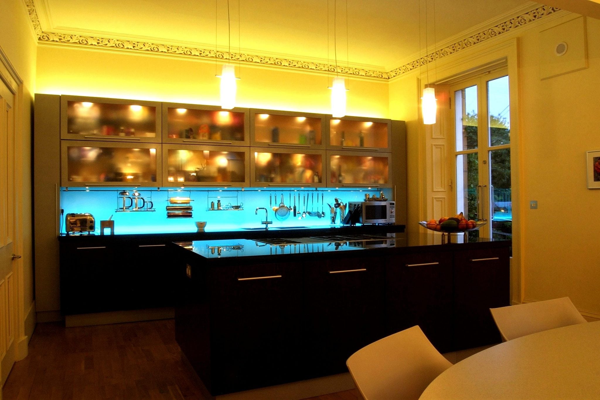 لخياراتنا في الإضاءة الداخلية تأثير كبير على أناقة الديكور، فهي تمنح المساحة عمقاً ودفءً، ويمكنكِ استخدام الإضاءة في الزوايا لتمنح الصالة عمقاً، كما يمكنكِ استخدام إضاءة في الأرفف الزجاجية، لتمنحكِ إنعكاساً أنيقاً، بالإضافة إلى ذلك يمكنكِ تسليط الضوء على اللوحات، التي تزيّن صالة الجلوس، أو صالة الضيوف لإضفاء جمالية عليها.