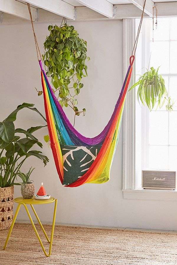 أرجوحة بسيطة معلّقة، من القماش القوي بألوان قوس قزح، يمكن وضعها بجوار الجدران البيضاء، لتوفّر بهجة لا مثيل لها في المكان.