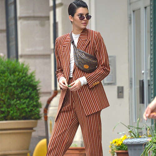 ارتدت العارضة العالمية كيندال جينر، على إحدى منصّات عروض الأزياء، حقيبة الخصر على أحد الكتفين، لتصل إلى الخصر، ونسّقت الحقيبة مع بدلة رجالية مخطّطة وتي شيرت أبيض.