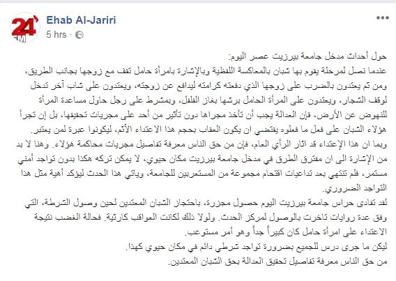 وتابع:”لقد تفادى حراس جامعة بيرزيت اليوم حصول مجزرة، باحتجاز الشبان المعتدين لحين وصول الشرطة، التي وفق عدة روايات تاخرت بالوصول لمركز الحدث. ولولا ذلك لكانت العواقب كارثية. فحالة الغضب نتيجة الاعتداء على امرأة حامل كان كبيراً جداً وهو أمر مستوعب.