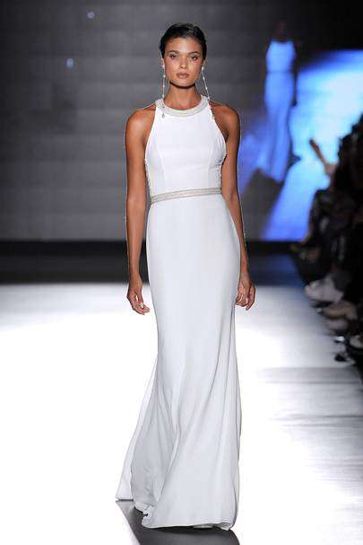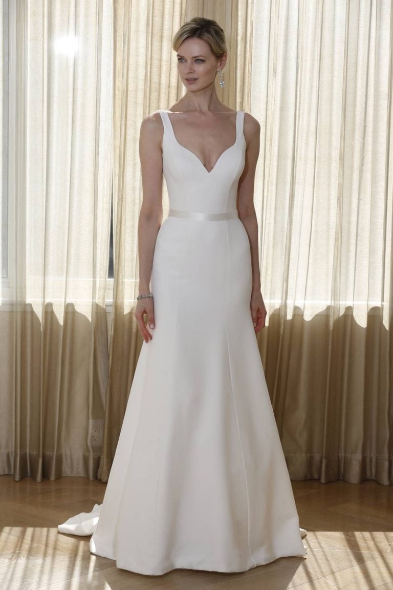فستان زفاف من الساتان، مكشوف الصدر، بحزام خصر من الساتان، من تصميم كارولين كاستيغليانو.