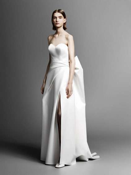 فستان زفاف من الساتان، مكشوف الصدر، وذو فتحة ساق لافتة، من توقيع Viktor & Rolf.