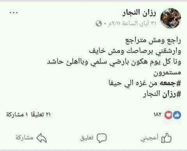 تداول نشطاء مواقع التواصل الاجتماعي، آخر ما كتبته الشهيد رزان النجار والتي أطلق عليها اسم “ملاك الرحمة”، على موقع فيسبوك.