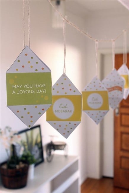 بكل بساطة يمكنك أن تستعملي الاشغال اليدوية التي تحمل شعارات ورسمات خاصة لعيد الفطر وتعليقها بشكل هندسي على الحبال داخل أرجاء المنزل، ما يضفي المرح على الأجماء العائلية.