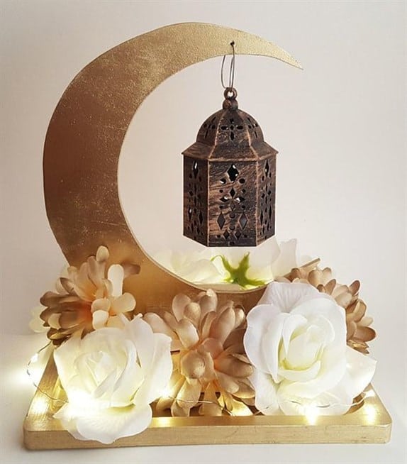 كوني مبتكرة باختيار قواعد خاصة بالإضاءة لعيد الفطر من خلال تعليق الفانوس النحاسي بطريقة هندسية مع اللون الذهبي البارز من خلال القمر، واجعلي هذه القطعة قاعدة أساسية للطاولات بأسلوب مميز مع الازهار المتعددة.