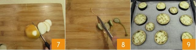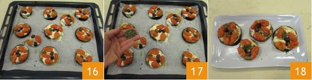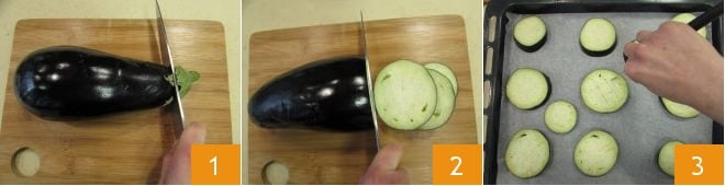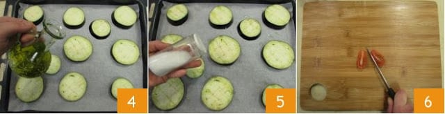 صب  الزيت و قليل من الملح على شرائح الباذنجان ، ثم يسخن الفرن مسبقا عند 200 درجة لمدة 10 دقائق وتوضع على الرف السفلي. وفي الوقت نفسه، غسل وتجفيف الطماطم  ثم تقطيعها إلى  نصفين .