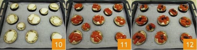 ثم يضاف إلى كل شريحة من الباذنجان  جبن سكامورزا و الطماطم  وزوج من الزيتون المقشر.
