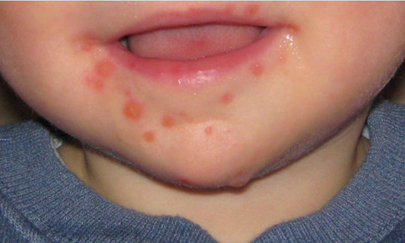 – طفح جلدي على شكل بقع حمراء مسطحة أو ناتئة على راحتي اليدين وأخمص القدمين وتحت الحفاض، ومن الممكن انتشارها إلى المرفقين والركبتين، ثم تتحول البقع إلى بثور رمادية مع قاعدة حمراء، هذا الطفح لا يسبب الحكة ومن الممكن أن يكون مصحوبًا بنفاطات صغيرة.