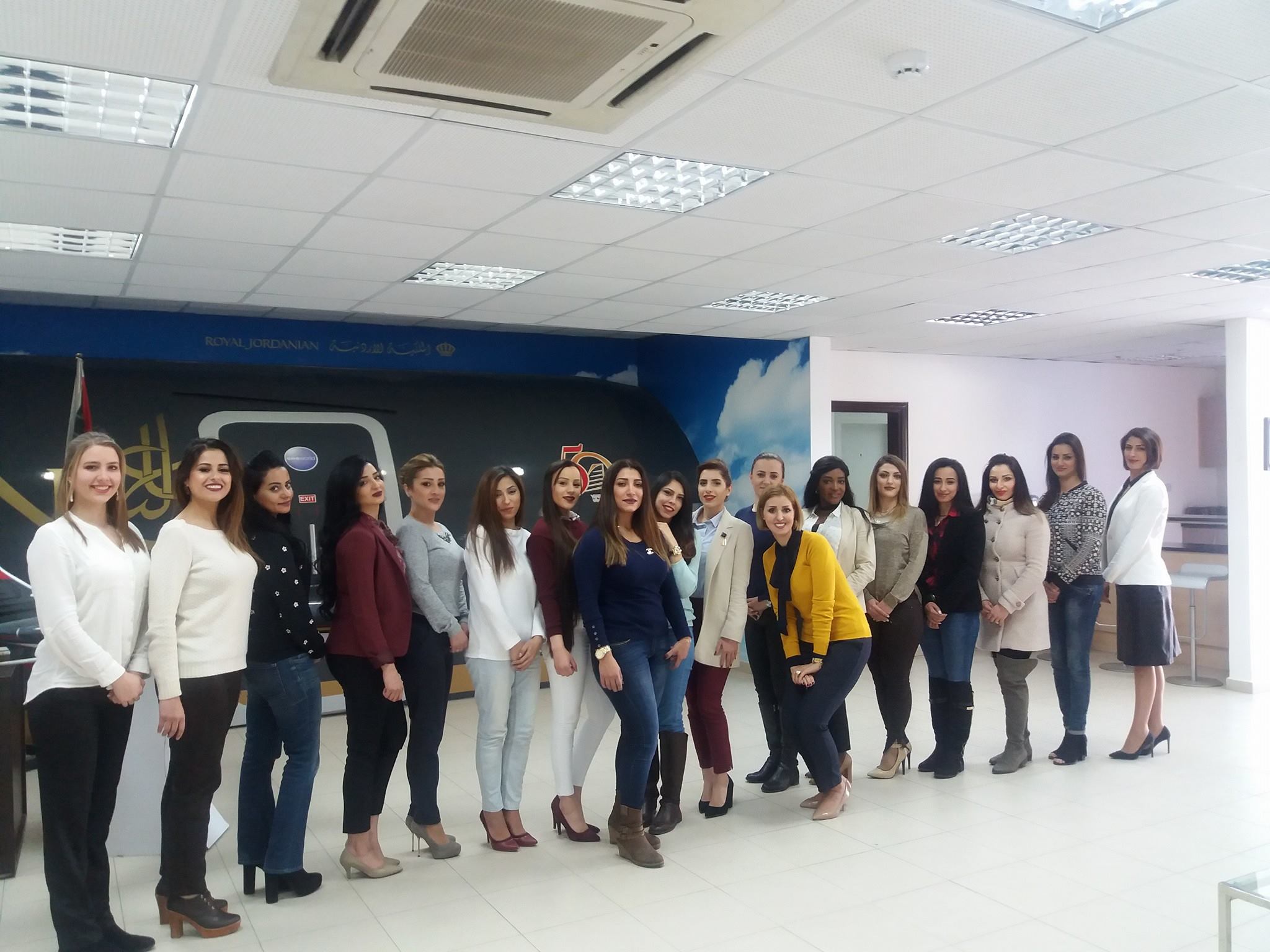 الخبيرة نسرين حداد خلال تقديم ورشة تدريبية لمضيفات طيران الملكية الاردنية حول طريقة وضع المكياج خلال العمل