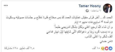 تامر تواصل مع محبيه عبر حسابه الشخصي بموقع الفيس بوك قائلًا: الحمد لله.. آخر قرار مفيش عمليات الحمد لله، بس محتاج فترة علاج وجلسات صوتية وسكوت تام لمدة ٣ أسابيع.