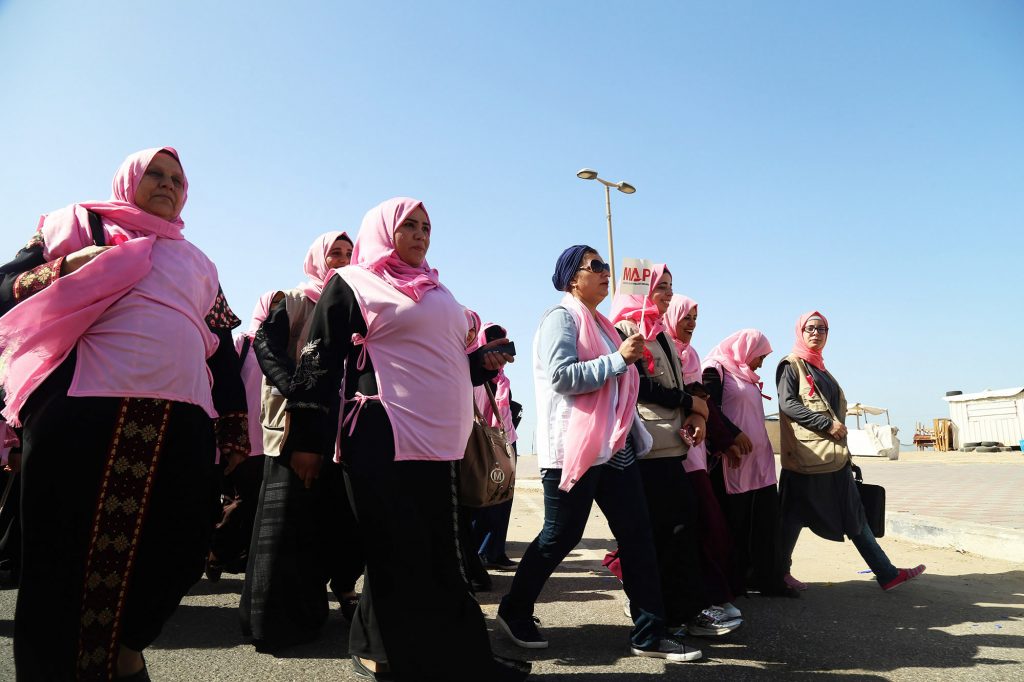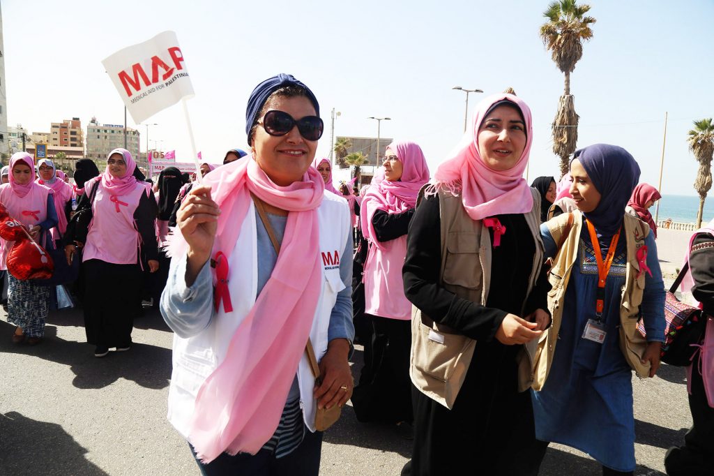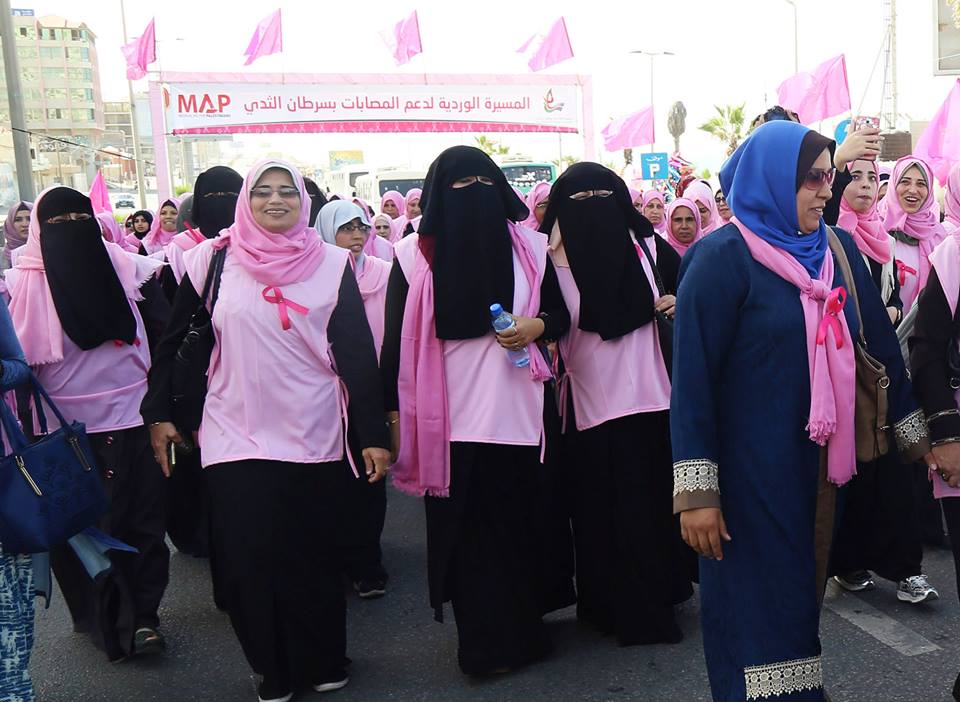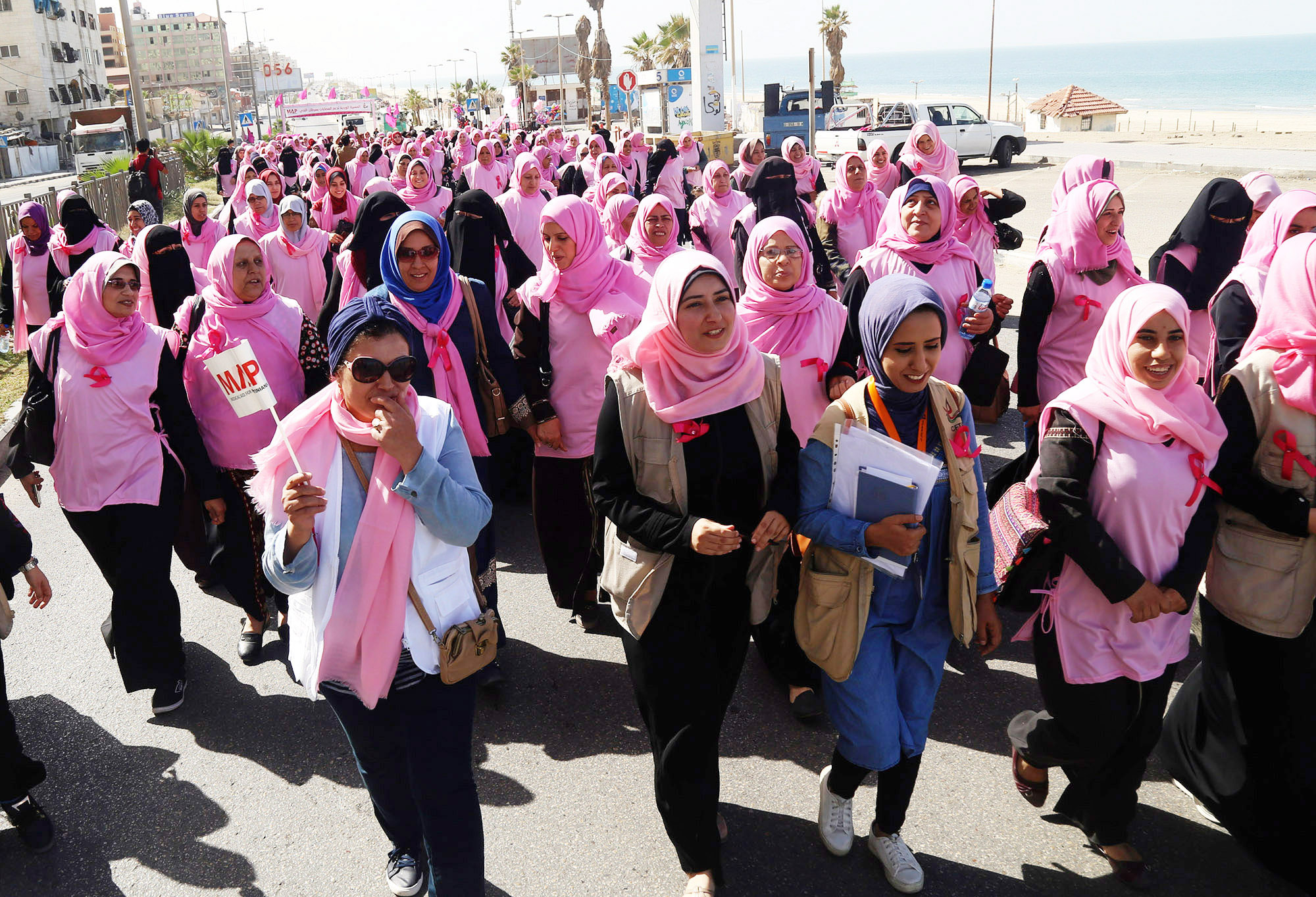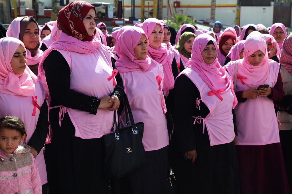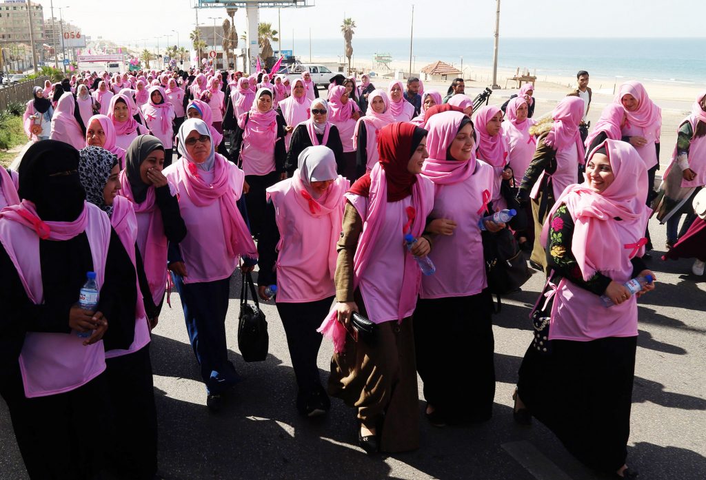 شاركت عشرات النساء في قطاع غزة، اليوم الثلاثاء، في مسيرة وردية للتوعية بمرض سرطان الثدي، ومساندة حق المريضات بضرورة تلقى رعاية صحية متكاملة بالقطاع وحقهن بالعلاج بالخارج.