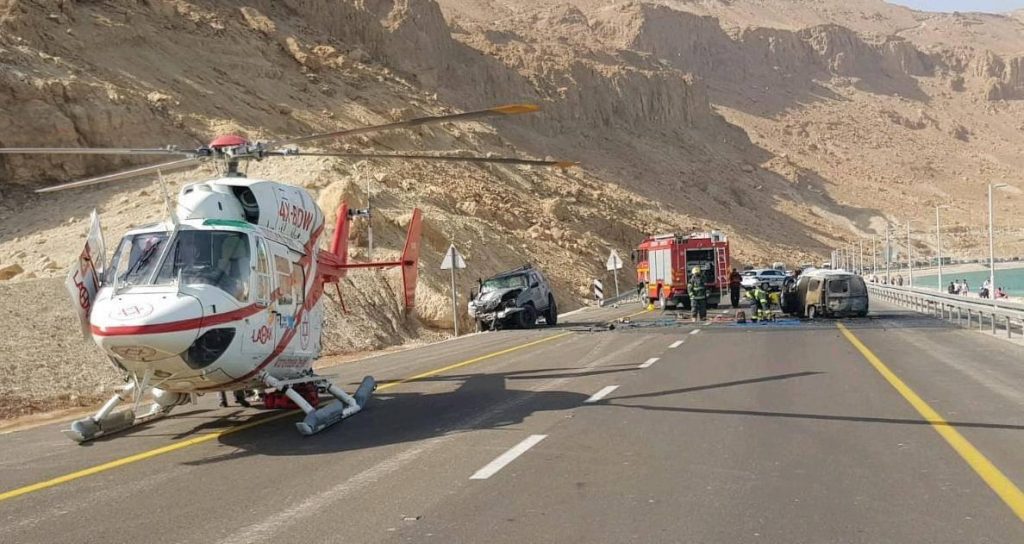 وأفادت مصادر في الإسعاف الإسرائيلي، أن حادث تصادم وجها لوجه وقع بين سيارتين على شارع رقم (90) من منطقة البحر الميت باتجاه عين جدي، وأدى ذلك إلى اشتعال النيران بإحدى السيارتين والتي تقل ثمانية أشخاص بينهم ستة أطفال، أعلن الأطباء وفاتهم جميعا.