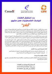 غيداء الكوبري- أعلنت المؤسسة الأهلية منتدى سيدات الأعمال عن بدء استقبال طلبات الترشح للرياديات الفلسطينيات ضمن مشروع “الرياديون من النساء والشباب يقودون التغيير – أُبادر”، والذي تنفذه مؤسسة كير الدولية؛ وبدعم من حكومة كندا لمدة أربع سنوات 2018-2022، بالشراكة مع منتدى سيدات الأعمال ومركز التعليم المستمر في جامعة بيرزيت في الضفة الغربية، وجمعية إنقاذ المستقبل الشبابي وجمعية مركز المؤسسات الصغيرة في قطاع غزة.