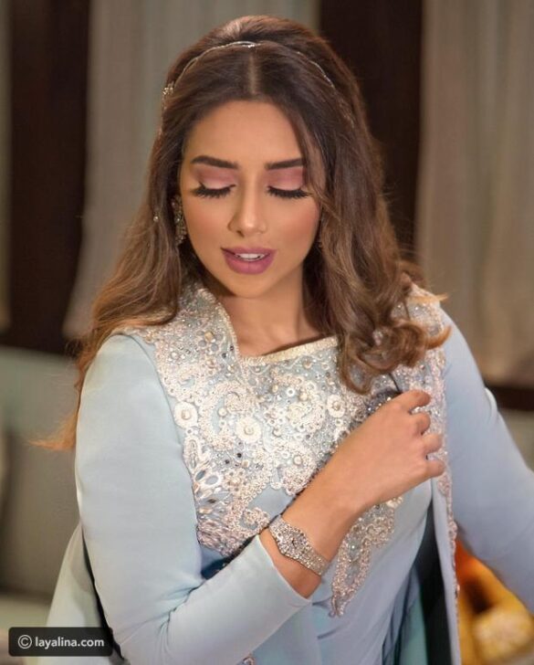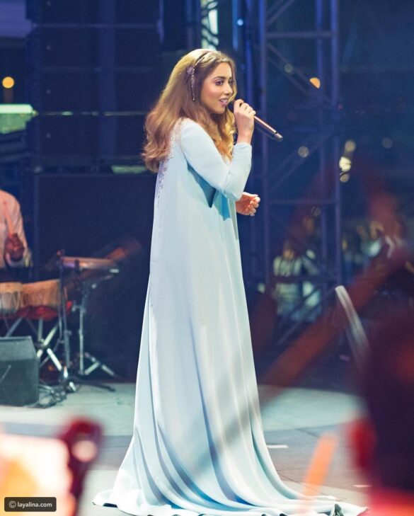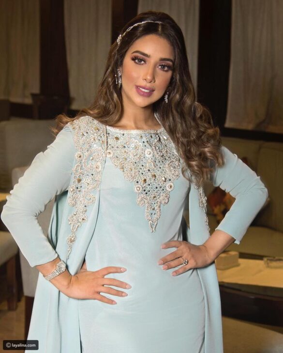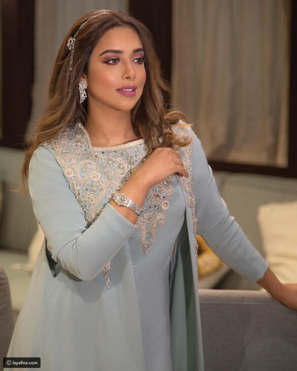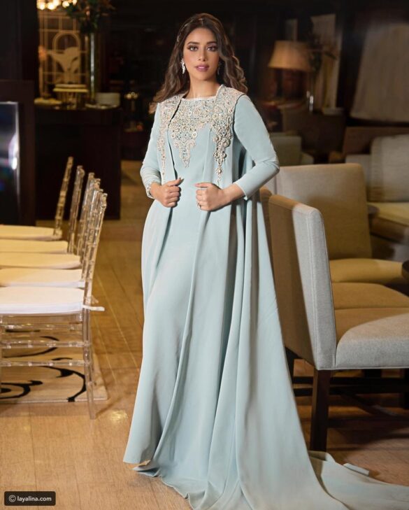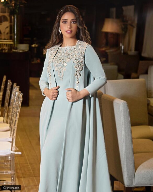 كما تألقت النجمة اليمنية المقيمة في الإمارات بجلباب سعودي فخم باللون الأزرق السماوي والمطرز على الصدر بتطريزات عربية فضية مزينة بالأحجار الملونة، والذي تزين أيضاً بكارديغان بدون أكمام وبذيل طويل.