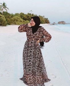 اختارت مروة حسن فستانًا من رسومات الحيوانات البرية، الرائجة هذا العام، مفتوح قليلًا من ناحية الصدر، لهذا اعتمدت معه حجابًا أسود عريضًا يغطي هذه المنطقة.