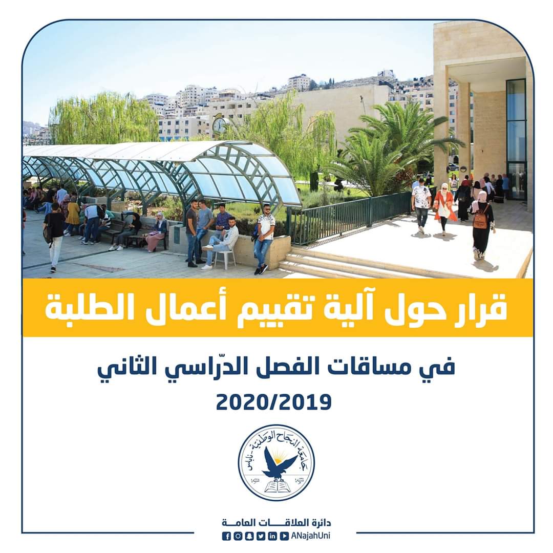 قررت إدارة جامعة النجاح الوطنية ما يأتي بخصوص آلية تقييم أعمال الطلبة في مساقات الفصل الدراسي الثاني للعام 2019/2020 ولهذا الفصل فقط