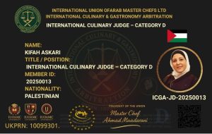 في مشهد جديد يُضاف إلى سجل إنجازات المرأة الفلسطينية، حقّقت الشيف كفاح سبع العيش إنجازًا نوعيًا بتتويجها كأول حَكَم دولي فلسطيني في مجال فنون الطهي، بعد اعتمادها رسميًا من الاتحاد الدولي لماستر شيف العرب – International Union of Arab Master Chefs Ltd، المسجّل في المملكة المتحدة، والمعتمد قانونيًا وأكاديميًا في بريطانيا والولايات المتحدة وفرنسا.