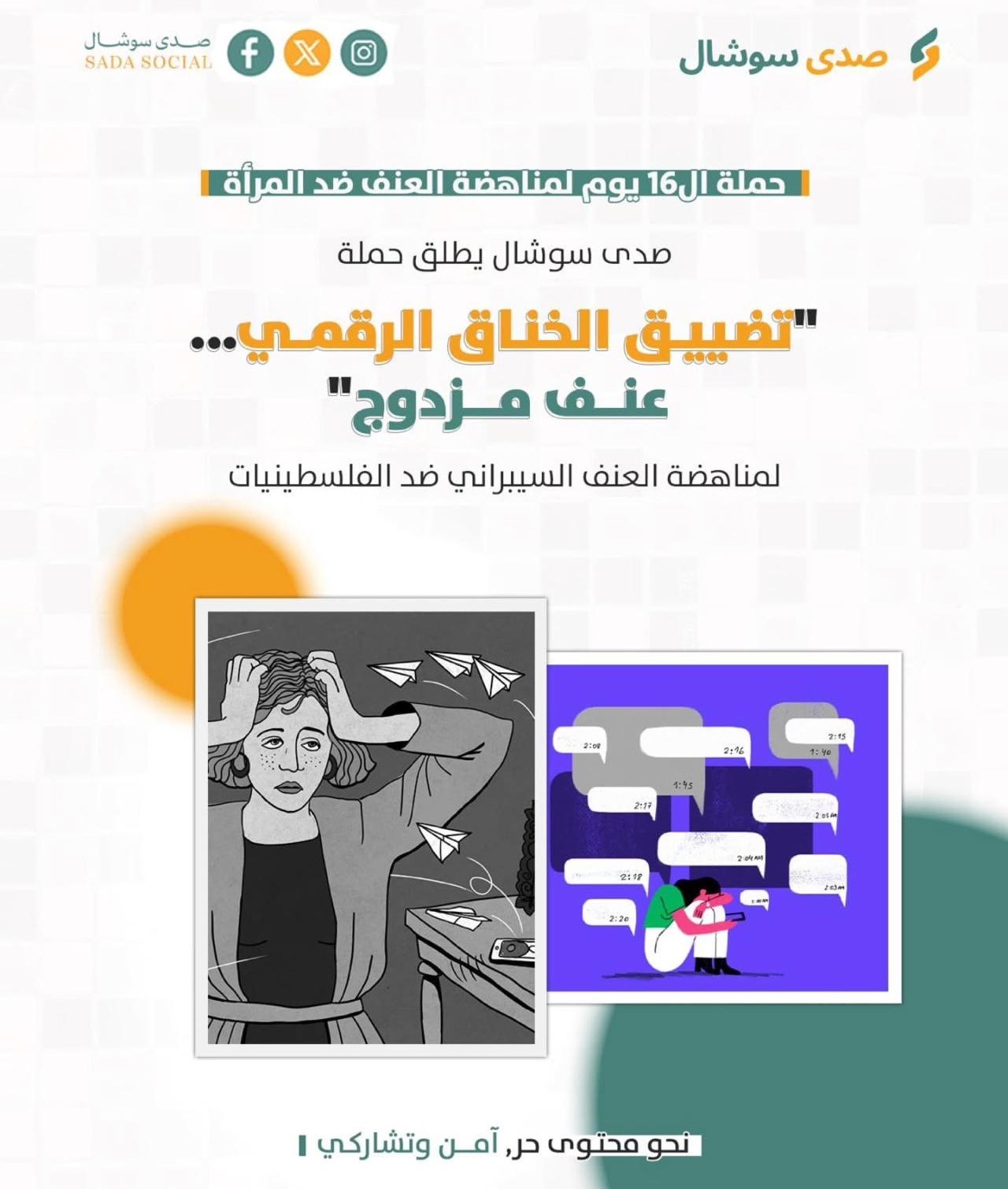 أطلق مركز صدى سوشال للحقوق الرقمية اليوم، بالتزامن مع بدء حملة الـ 16 يومًا لمناهضة العنف ضد المرأة (الممتدة من 25 نوفمبر حتى 10 ديسمبر)، حملة توعوية ورقمية جديدة تحت عنوان: “تضييق الخناق الرقمي… عنف مزدوج”. وتهدف الحملة إلى تسليط الضوء على الأبعاد المتفاقمة للعنف السيبراني والرقابة المشددة التي تتعرض لها المرأة الفلسطينية، خاصة الناشطات والحقوقيات، في الفضاء الرقمي.