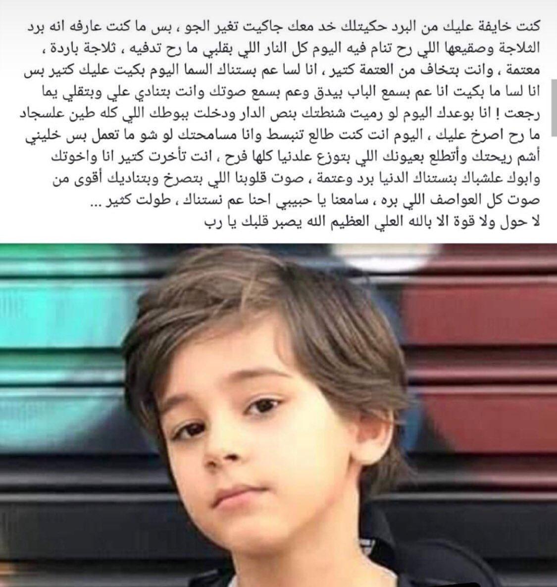 ابنتي.. لو تعلمي بما في قلبي من حرقة على غيابك.. وفاتك أطفأت شعلة السعادة التي كانت تضيء في داخلي.. هناك /صدع/ في الفؤاد لاينجبر أبدا’.. كلما مر طيفك أو لاحت ذكراك.. فأنت فارقتنا بجسدك لكن ذكراك والله ستظل باقية أبد الدهر.. مشعل ضياء ونبراس نور مهما طال الغياب يا ابنتي. ولفتك الأرض فلن أنساك.. ما أشد ظلمة الحياة عندما فقدتك لكنه قدر الله.. ابنتي .. هذه نفثة من صدري كتبتها بمداد المحبة.. أما حبك فلا تكفيه هذه الكلمات.. بقيت أنا في هذه الدنيا ورحلت أنت إلى الآخرة لكن هناك كلمة أود أيصالها لك: ((أحــــبك يا ابنتي)) فهل ستسمعيها ؟ لقاؤنا في جنة الخلد إن شاءالله..)) هل تصلك رسالتي؟.. انها من نزف مشاعري وأحاسيسي.. ما عاد بوسعي الآن أن أسقيك أو أطعمك أو أدفئك..فما وجدت أمامي سوى أن أكتب لك بعضا من نبض قلبي.. وما عساي الا ان اقول… ((انا لله وإنا إليه راجعون)) الله يرحمك يا قطعة مني ويجعل مثواكي جنان الخلد والنعيم يا ابنتي الغالية تالا الجميله’.