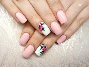 مناكير الأزهار مع لمسة خضراء: مهما كان لون المناكير الذي تختارينه، يُنصح باستخدام الريشة الرفيعة، لإضافة أوراق خضراء إلى الأزهار المرسومة. ومن الحيل المميّزة التي يمكن تبنّيها للحصول على نتيجة رائعة، هي في رسم الأزهار على خلفية بيضاء ناصعة، لتوليد تناقض بصري مع اللون الأخضر.